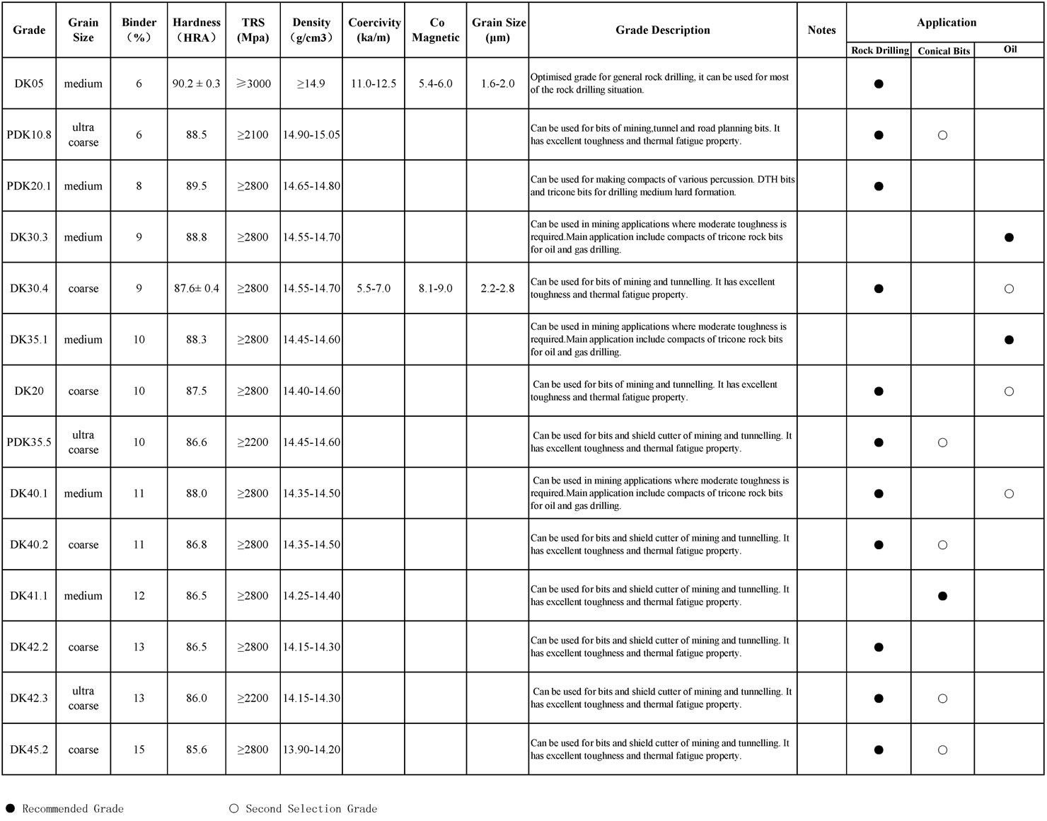 DEWEI CARBIDE have various grade for mining and construction drilling purpose. It could be used for DTH bits, Tri-cone Bits, Coal Bits, Conical Bits, Road Milling Bits, TBM cutters, Crusher Hammer Bits and so on.